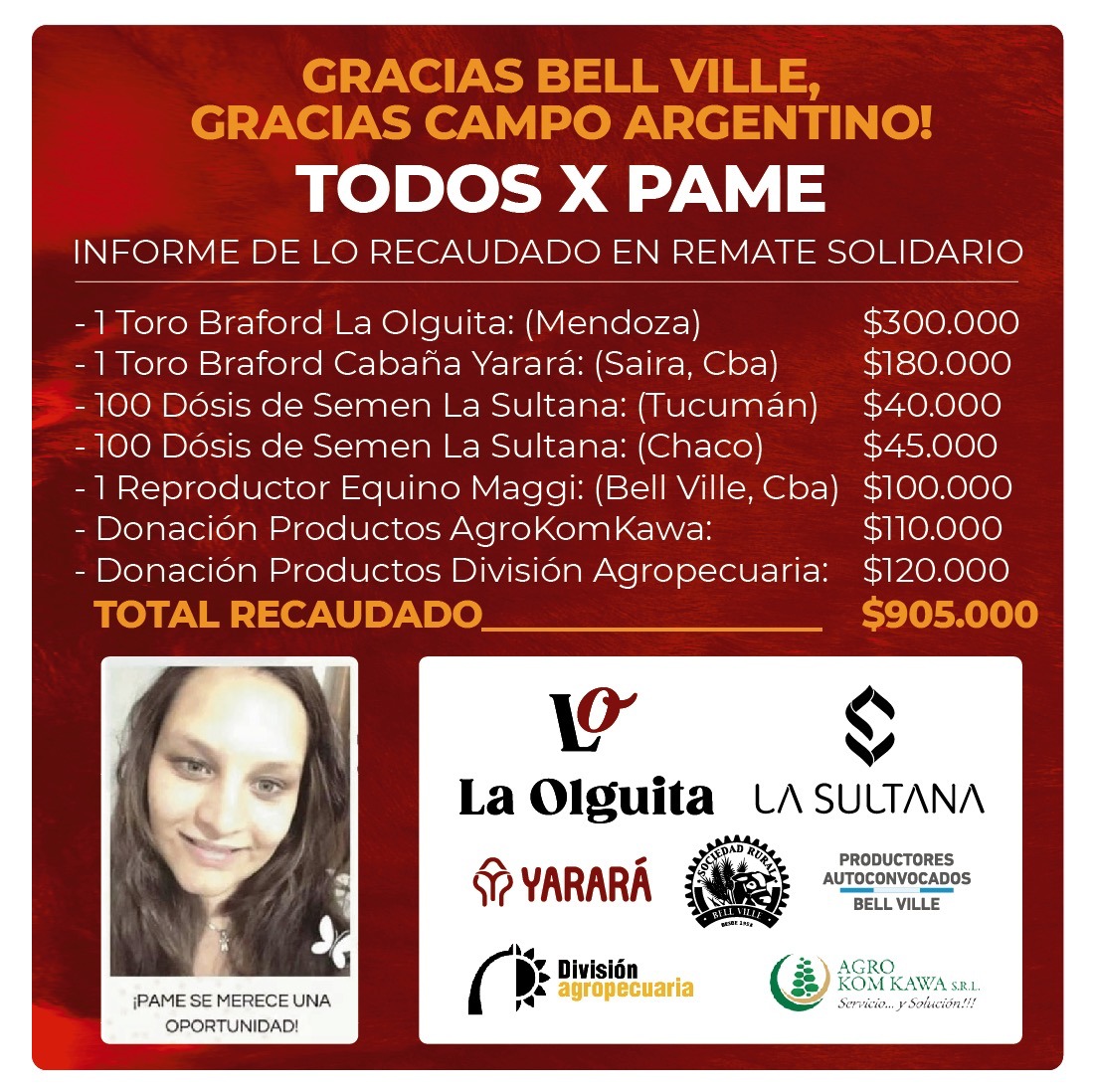 MÁS DE 900 MIL PESOS RECAUDARON EMPRESAS AGROPECUARIAS PARA AYUDAR A PAMELA MARTIN
