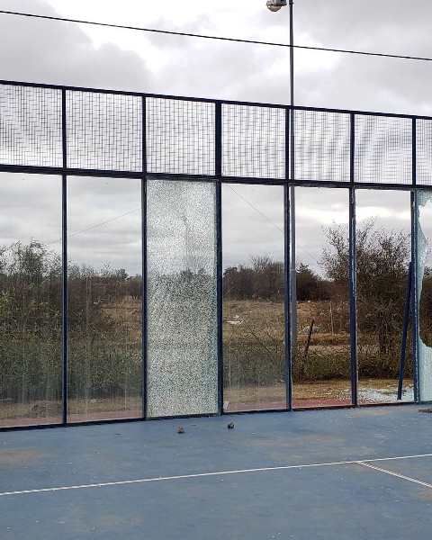 Tras cumplirse una semana de los primeros ataques, la cancha de pádel sufrió destrozos de tres blindex con piedras.